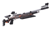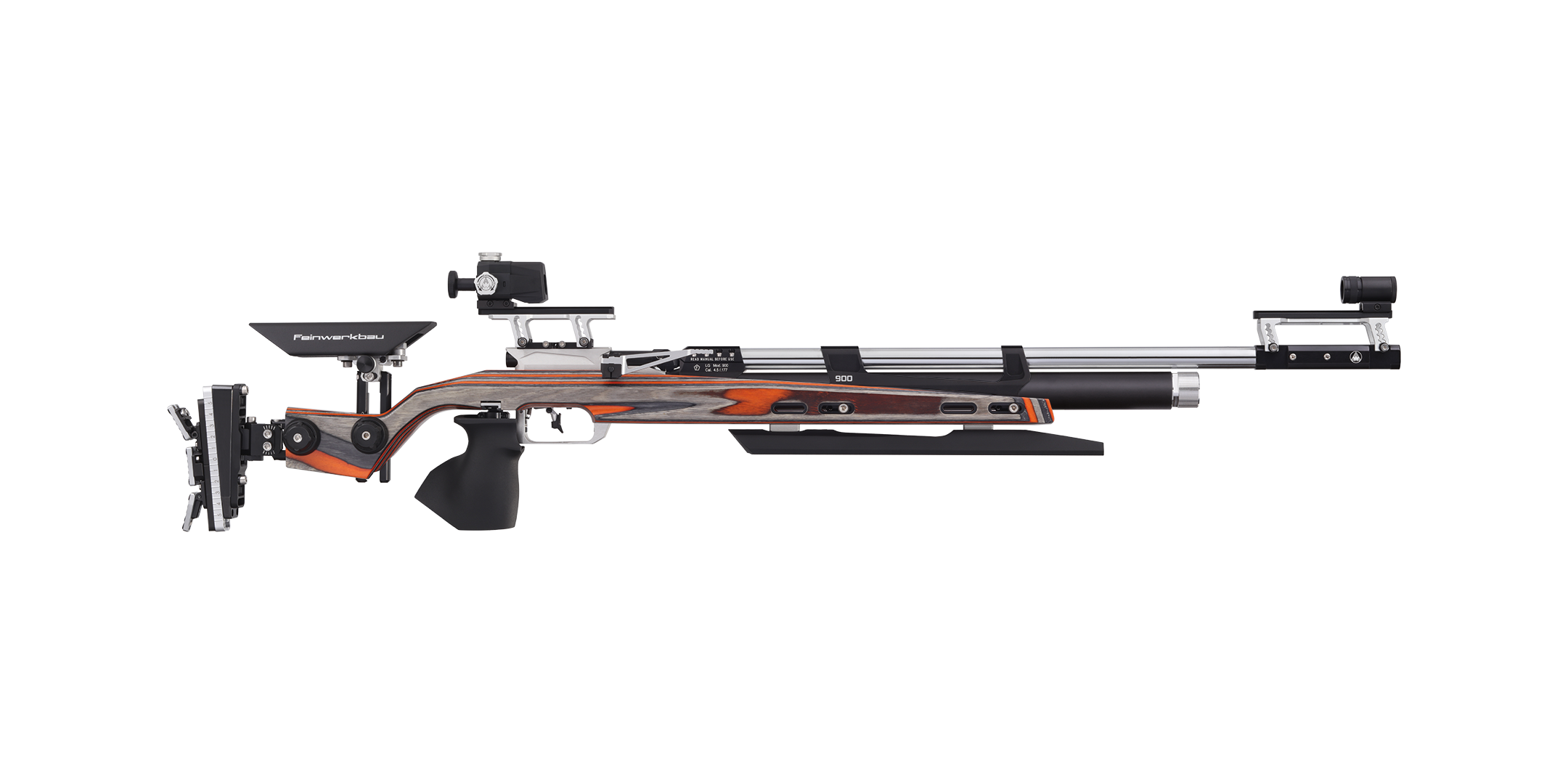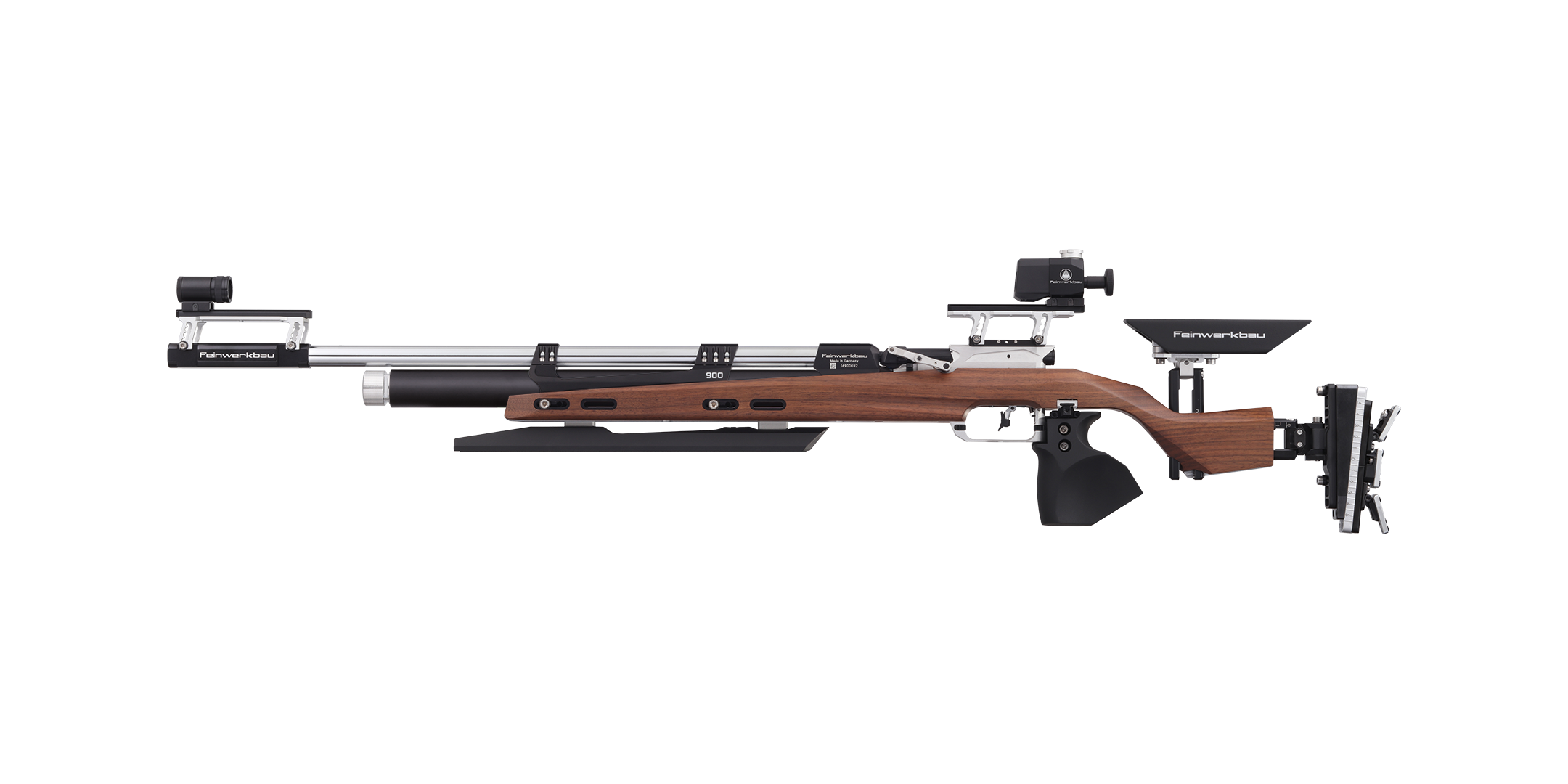 The flat front stock allows the greatest possible benchrest adjustment range for benchrest shooting. The cheek piece and butt plate (as with the aluminum stock models) can be easily and continuously adjusted in height and length via adjustment gears. The specially raised cheek piece ensures a comfortable shooting position and the benchrest version of the 900W model series is equipped with a wedge-shaped weight (330 grams) in the butt plate. On request, a grip rail can be selected for comfortable positioning of the holding hand.